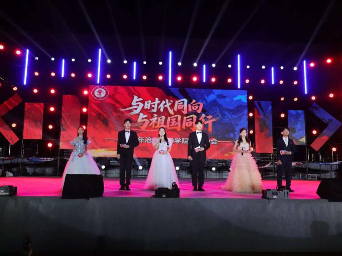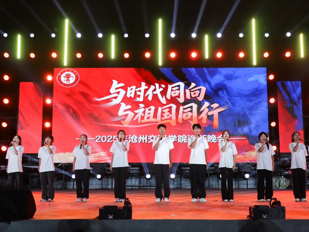 第一篇章以“与祖国同行”为核心脉络,通过歌曲、舞蹈与新生朗诵等形式,回溯沧交人始终紧跟时代的奋斗历程。轻快节奏里,青年乘“风”奔赴新程的勇气跃然舞台;灵动舞姿中,丰收的喜悦与奋斗的成果被生动勾勒;悠扬旋律里,温暖深情的家国情怀缓缓流淌。令人动容的是,九个学院大一新生代表的朗诵《启程》,以初心与热爱诠释“传承使命、追逐梦想”的主题,将个人成长与时代使命紧密联结,展现出青年学子与时代同频共振的青春力量。
