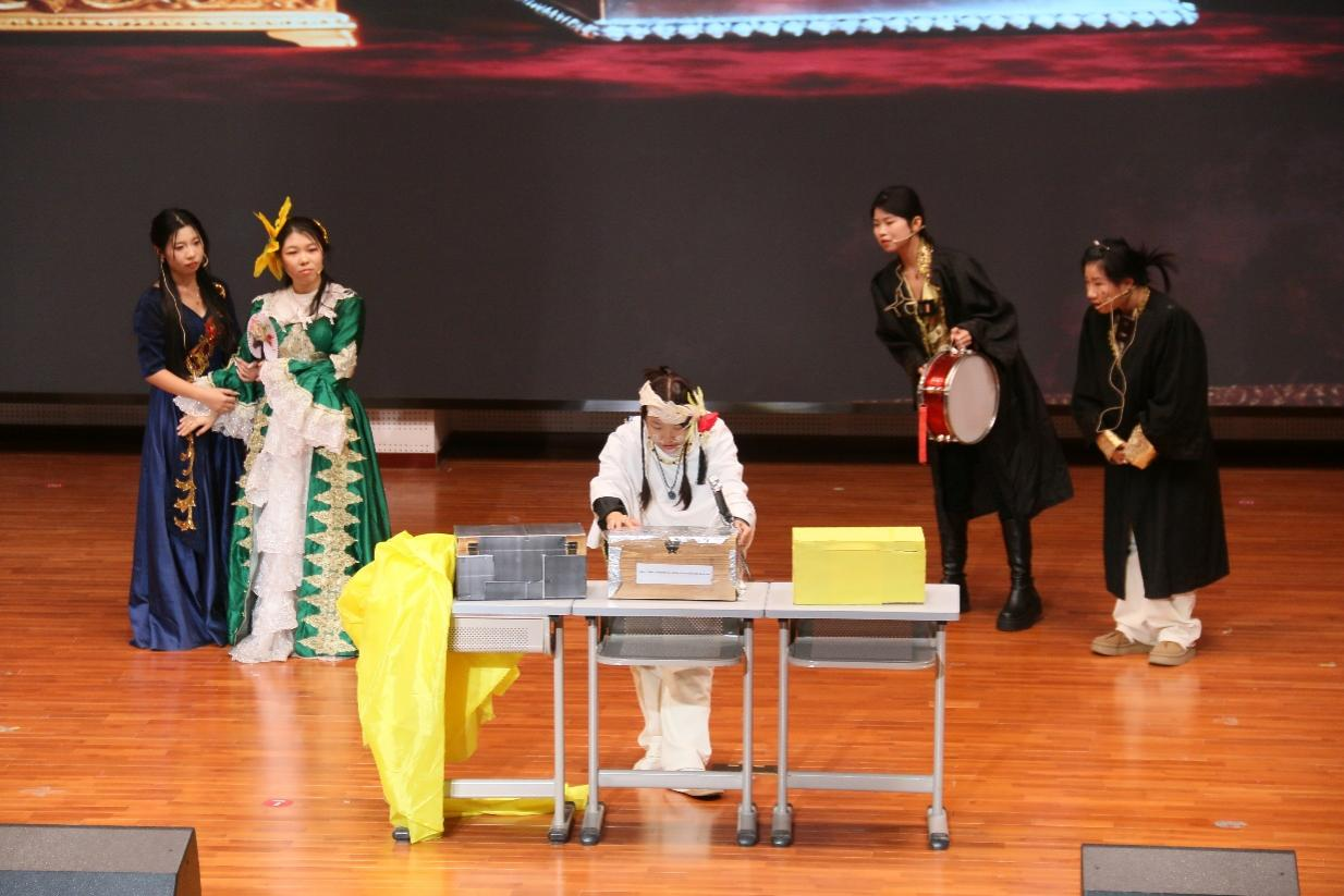 莎士比亚戏剧节”中脱颖而出的三支优秀英语专业剧组参演。由外国语学院副院长张丽教授、英语专业教研室主任陆朝霞教授带队,刘晨雨老师指导,刘同心、云楚然、李志晶、张伊静、王新媛同学表演的《错误的喜剧》荣获一等奖;王少杰老师指导,史慧莹、杨茜楠、厉弋茜、高梦美、路佳欣同学表演的《威尼斯商人》荣获二等奖;褚博文老师指导,韦雨萌、乔义谦、席越盈、常佳瑞同学表演的《驯悍记》荣获三等奖。同学们以流利的英文台词、精准的情感把握、富有张力的舞台表现和默契的团队协作,生动诠释了莎翁经典,展现了扎实的语言功底与深厚的人文素养。