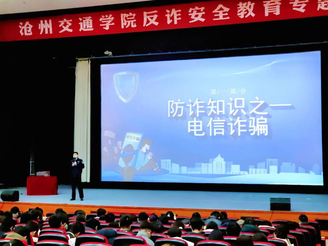 为切实筑牢校园安全防线,提升广大师生防范电信网络诈骗的意识和能力,12月24日,我校举办反诈安全教育专题讲座。副校长王忆宁出席活动,安全保卫处、学生处负责人,全体辅导员,学生党员、学生干部及学生代表等参加讲座。本次讲座特邀渤海新区黄骅市公安局反诈中心主任孙涛、民警胡博程担任主讲。